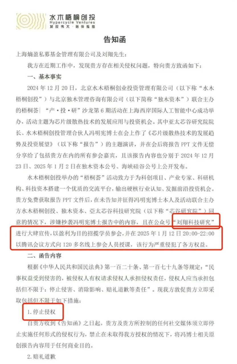 随后,水木梧桐创投注意到,海熵盈私募免费获取报告PPT文件后,在未告知并征得冯明宪本人及活动联合主办方水木梧桐创投、独木资本、芯谷研究院同意的情况下,涉嫌抄袭冯明宪报告中的内容,且在公众号“刘翔科技研究”进行大肆宣传,以营利为目的招揽学员参会,并在2025年1月12日20:00-22:00以腾讯会议方式向120多名线上参会人员授课,该行为严重侵犯了各方权益。水木梧桐创投告知书发送对象上海熵盈私募及刘翔,投资圈中并不陌生。相关履历显示,刘翔自2011年进入证券行业,2012年开始担任电子行业首席分析师,历经国信证券、太平洋证券、中泰证券以及开源证券的首席分析师,在开源证券期间,他还担任公司董事总经理、研究所副所长。
