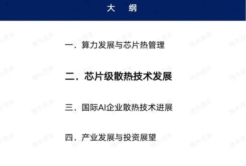 财联社记者查阅水木梧桐创投相关公众号获悉,冯明宪的报告主要围绕着算力发展与芯片热管理进行论述,详细介绍了芯片级散热技术的发展情况,国际AI企业散热技术进展以及相关产业发展与给投资者展望,是一份详细的产业报告。