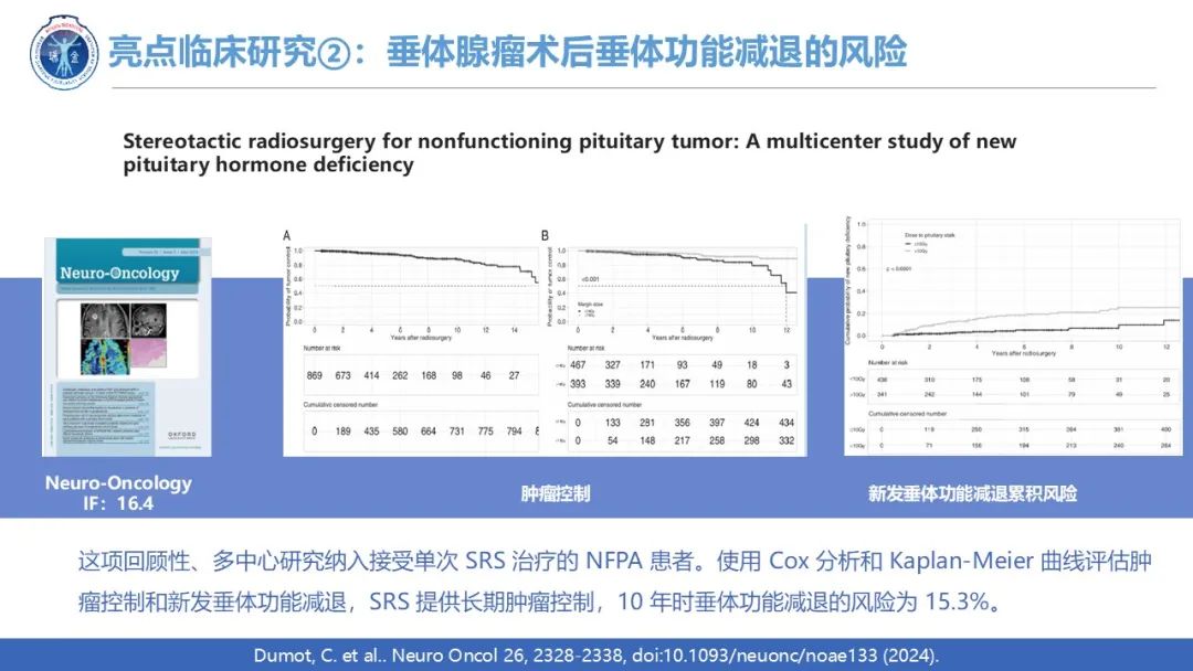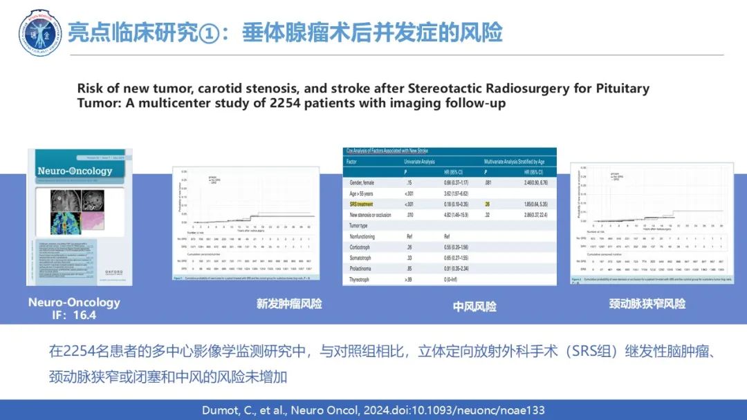 对于垂体瘤的治疗,放疗发挥重要作用,但常规放疗往往伴随着并发症的发生,影响着临床上的决策。立体定向放射外科 (SRS) 是一种更有针对性的方法,现在越来越多地被临床应用。例如来自美国弗吉尼亚大学神经外科Jason P Sheehan教授连续于2024年4月、12月在国际知名期刊Neuro-Oncology发表两项关于SRS临床研究,旨在评估SRS对垂体瘤的新发并发症发生率。与常规放疗对照组相比,SRS 组在影像学监测下未见长期继发性脑肿瘤(p=0.6),新发颈动脉狭窄或闭塞(p=0.8)和中风的风险增加(p=0.26)。此外, SRS 提供长期肿瘤控制且术后10 年垂体功能减退的风险为 15.3%。