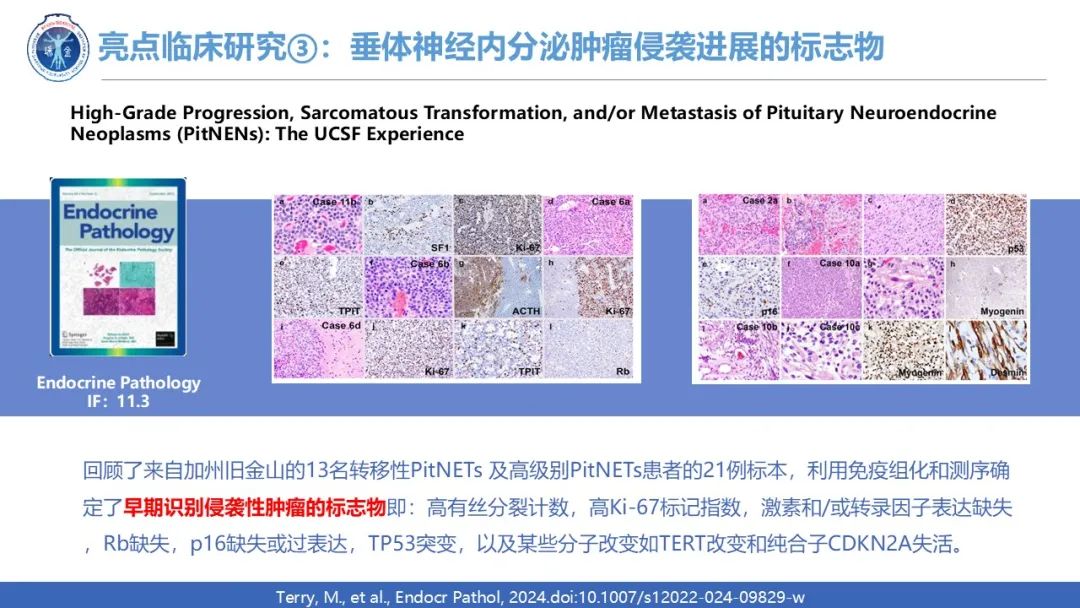 临床上,侵袭性垂体内分泌肿瘤有着一些很典型的分子改变:来自美国加州大学旧金山分校神经外科的13名转移性PitNETs 及高级别PitNETs患者的21例标本的免疫组化和测序确定了早期识别侵袭性肿瘤的标志物即:高有丝分裂计数,高Ki-67标记指数,激素和/或转录因子表达缺失,Rb缺失,p16缺失或过表达,TP53突变,以及某些分子改变如TERT改变和纯合子CDKN2A失活,该成果2024年12月发表期刊国际期刊Endocrine Pathology上。