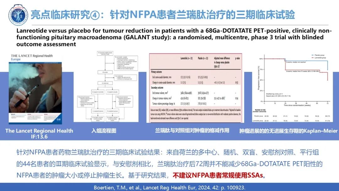 药物治疗的范围在不断扩大,并延申至无功能腺瘤并已进行相应的临床实验。非功能性垂体大腺瘤(NFPMA)的患者目前缺乏确立的药物治疗选择。研究表明,生长抑素类似物(SSA)可能有助于抑制肿瘤生长,但尚无随机对照试验的证据支持。2024年2月发表在Lancet Reg Health Eur的来自荷兰三家医院一项多中心、随机、双盲、安慰剂对照的 III 期临床试验,它旨在评估兰瑞肽(一种长效生长抑素类似物)对 68Ga-DOTATATE PET 阳性 NFPMA 患者肿瘤大小的影响。纳入患有 44例Ga-DOTATATE PET 阳性 NFPMA 的成年患者(直径 ≥10 mm 的术后残留或未经手术的垂体大腺瘤)。将 44 名 PET 阳性的患者随机分配至兰瑞肽或安慰剂组,治疗结束时,兰瑞肽组与安慰剂组之间的肿瘤最大直径变化无显著差异(95%CI−1.3 to1.2, p=0.93)。两组在肿瘤体积、肿瘤进展时间以及生活质量评分的变化上均未见显著差异。兰瑞肽组较安慰剂组不良事件发生率较高(100% vs. 95%),其中胃肠道相关不良事件最常见。
