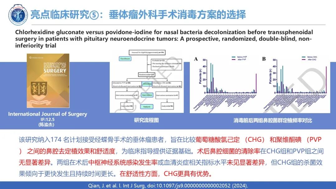 外科手术,工欲善其事必先利其器,外科消毒是一台完美外科手术的重要组成部分,旨在避免感染等并发症。来自陆军军医大学西南医院神经外科陈渝杰教授2024年8月在International Journal of Surgery发表了一项有关消毒剂在垂体瘤手术应用的前瞻性、随机、单盲临床试验,旨在比较葡萄糖酸氯己定 (CHG) 和聚维酮碘 (PVP) 之间的鼻腔去定植效果和舒适度,为临床指导提供证据基础。该研究纳入174 名计划接受经蝶骨手术的垂体神经内分泌肿瘤患者,术后鼻腔细菌的清除率在CHG组和PVP组之间无显著差异(88.64% vs. 82.56%; 95%CI: [-5.30, 17.50])。两组在术后中枢神经系统感染发生率或血清炎症相关指标水平未见显著差异,但CHG组的杀菌效果倾向于更快发生且持续时间更长。在舒适性方面,CHG似乎具有优势,包括较少的鼻腔刺激感、较低的刺激性气味以及更好的鼻腔着色效果。