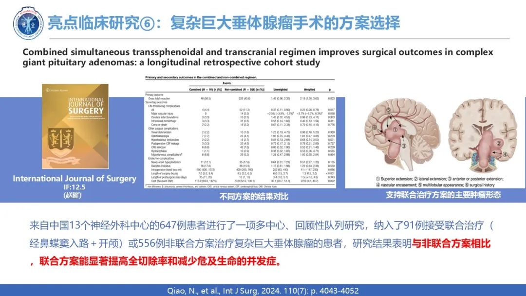 外科手术依旧是垂体瘤临床的一大重要板块,2024年7月由复旦大学附属华山医院神经外科赵曜教授牵头,联合来自中国的 13 个神经外科中心进行了一项回顾性、多中心研究,该研究发表在国际外科学杂志在International Journal of Surgery,旨在评估经蝶骨和经颅入路联合治疗巨大复杂垂体腺瘤(GPA)的有效性和安全性。纳入 647 名患有复杂 GPA 的患者 91 名在联合组中,556 名在非联合组。与非联合方案相比,联合治疗与较高的大体全切除概率相关 (50.5% vs. 40.6%, OR:2.18,95% CI:1.30-3.63,P = 0.003)。 联合组发生危及生命的并发症的患者比例低于非联合组 (4.4% vs. 11.2%,OR: 0.25,95% CI: 0.08–0.78,P = 0.017)。 在其他手术或内分泌相关并发症方面,两组之间未发现显著差异。然而,与非联合方法相比,联合方案的平均手术持续时间更长(P < 0.001)及手术费用更高(P = 0.022)。