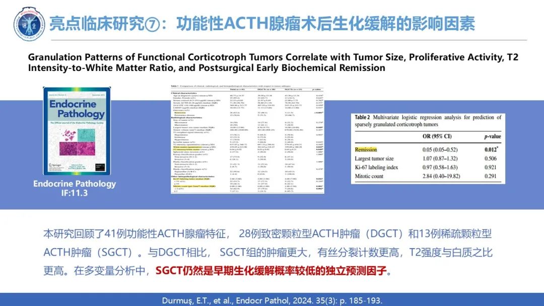 ACTH腺瘤由于其高异质性越来越在临床诊疗受到关注,肿瘤颗粒密度模式是影响垂体瘤生物学行为的重要因素,被列入WHO2022垂体瘤指南共识中,并逐渐得到临床的一致认可。来自土耳其的一项有关垂体瘤颗粒密度研究2024年9月在Endocrine Pathology发表,该研究回顾了41例功能性ACTH腺瘤特征, 28例致密颗粒型ACTH肿瘤(DGCT)和13例稀疏颗粒型ACTH肿瘤(SGCT)。与DGCT相比, SGCT组的肿瘤更大(p = 0.049),有丝分裂计数更高(p = 0.001),T2强度与白质之比更高(p=0.049)。在多变量分析中,SGCT仍然是早期生化缓解概率较低的独立预测因子(p = 0.012)。这提示临床医生对临床上稀疏颗粒型ACTH腺瘤治疗及随访的重视。