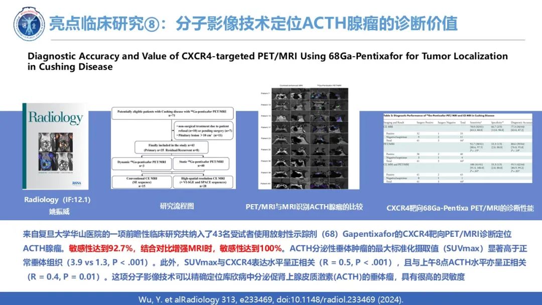 ACTH腺瘤具有小腺瘤大功能分泌的特点,很大一部分微腺瘤在MRI上无法检测到,此外异常MRI信号不一定提示功能性腺瘤,可能导致神经外科手术中的误解。复旦大学神经外科研究所张麒麟教授联合华山医院放射科姚振威教授,于2024年12月在影像学顶刊Radiology顶刊发表原创性前瞻性临床研究,指出使用放射性示踪剂(68)Gapentixafor的C-X-C趋化因子受体4型(CXCR4)靶向PET/MRI的诊断准确性和价值。这项技术可以精确定位库欣病中分泌促肾上腺皮质激素(ACTH)的垂体瘤,具有很高的灵敏度。引入了镓68标记的Pentixafor PET/MRI用于库欣病患者肿瘤定位的研究,共纳入了43名受试者。仅使用(68)Ga-Pentixafor PET/MRI定位41例分泌性ACTH腺瘤时,敏感性达到92.7%;结合对比增强MRI时,敏感性达到100%(41例肿瘤全部准确定位)。ACTH分泌性垂体肿瘤的最大标准化摄取值(SUVmax)显著高于正常垂体组织(3.9 vs 1.3, P < .001)。此外,SUVmax与CXCR4表达水平呈正相关(R = 0.5, P < .001),且与上午8点ACTH水平亦呈正相关(R = 0.4, P = 0.01)。