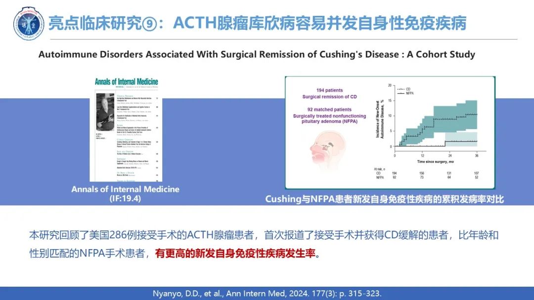 临床上,库欣病(CD)患者生化缓解后会伴随着自身免疫系统疾病的发生,2024年3月来自美国哈佛医学院发表在Annals of Internal Medicine的一项包括286例ACTH腺瘤患者的回顾性队列研究确定了手术缓解 CD 的患者比年龄和性别匹配的 NFPA 患者发生自身免疫性疾病的几率更高,并得出来自身免疫性疾病家族史是潜在的危险因素及肾上腺皮质功能减退症是诱因的结论。具体来说:CD 患者术后 3 年新发自身免疫性疾病的累积发生率 (10.4% ,95% CI [5.7%,15.1%])高于NFPA 患者(1.6%, 95%CI, [0% ,4.6%]) (HR:7.80, 95%CI,[2.88,21.10])。与 NFPA 患者相比,CD 患者术后肾上腺皮质功能减退症的患病率更高 (93.8% vs. 16.5%) 和更低的术后最低血清皮质醇水平 (63.8 vs. 282.3 nmol/L)。与无自身免疫性疾病的 CD 患者相比,发生自身免疫性疾病的患者术前 24 小时 UFC 比值较低 (2.7 vs. 6.3)和自身免疫性疾病家族史患病率较高 (41.2% vs. 20.9%)。