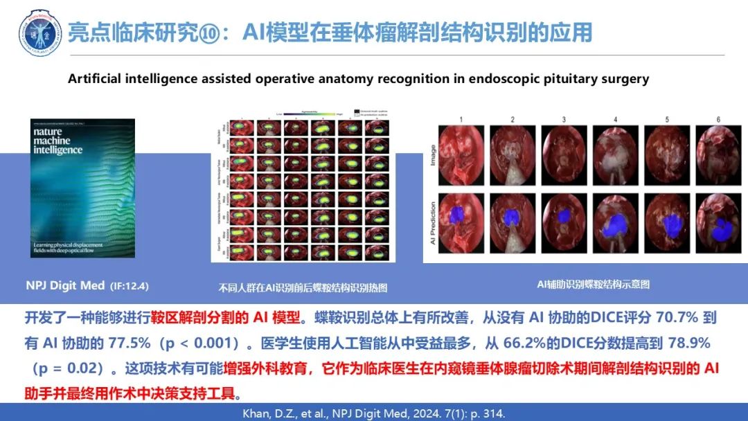 人工智能是近几年的热点,互联网+垂体瘤也在2024年垂体瘤领域碰撞出了火花,一篇有关AI模型在垂体瘤应用的文章2024年11月发表在数字医学期刊NPJ Digit Med。垂体体瘤被关键的神经血管结构包围,术中识别这些结构可能具有挑战性。该团队之前开发了一种能够进行鞍区解剖分割的 AI 模型。蝶鞍识别总体上有所改善,从没有 AI 协助的DICE评分 70.7% 到有 AI 协助的 77.5%(p < 0.001)。医学生使用人工智能从中受益最多,从 66.2%的DICE分数提高到 78.9% (p = 0.02)。这项技术有可能增强外科教育,它作为临床医生在内窥镜垂体腺瘤切除术期间解剖结构识别的 AI 助手并最终用作术中决策支持工具。