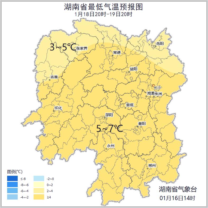 18日晚上到19日白天,晴天间多云;北风2~3级;最低气温湘北3~5℃,其他地区5~7℃;最高气温18~20℃。