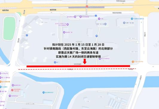 交通管制:针对驿南路段(西起鲁村路,东至云海路)的北侧部分,即靠近天聚广场一侧的两条车道,实施为期14天(2025年1月15日至1月28日)的封闭交通管制举措。管制期间,机动车辆将被禁止驶入该区域,非机动车辆与行人则可正常通行。