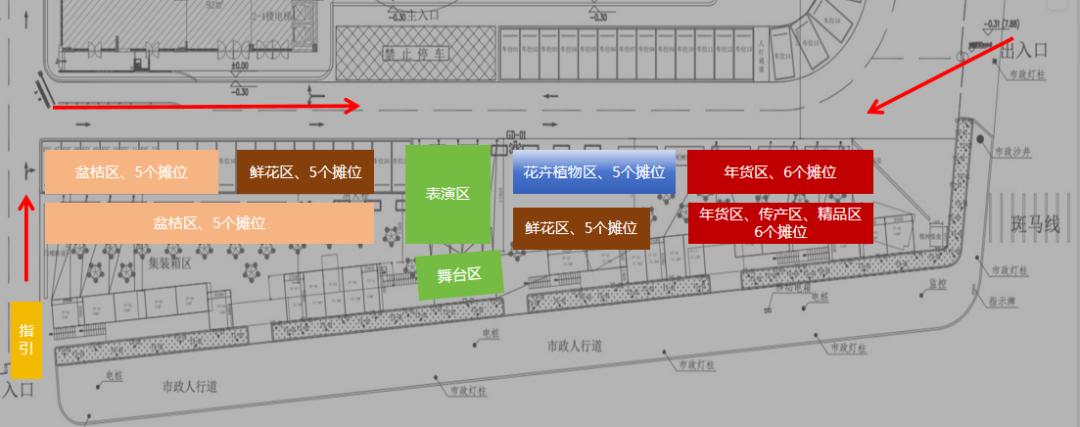 摊位情况:设置148个车展位,包括兰花区、游乐区、盆栽区、年货区、桃花区、文创区、年桔区等。
