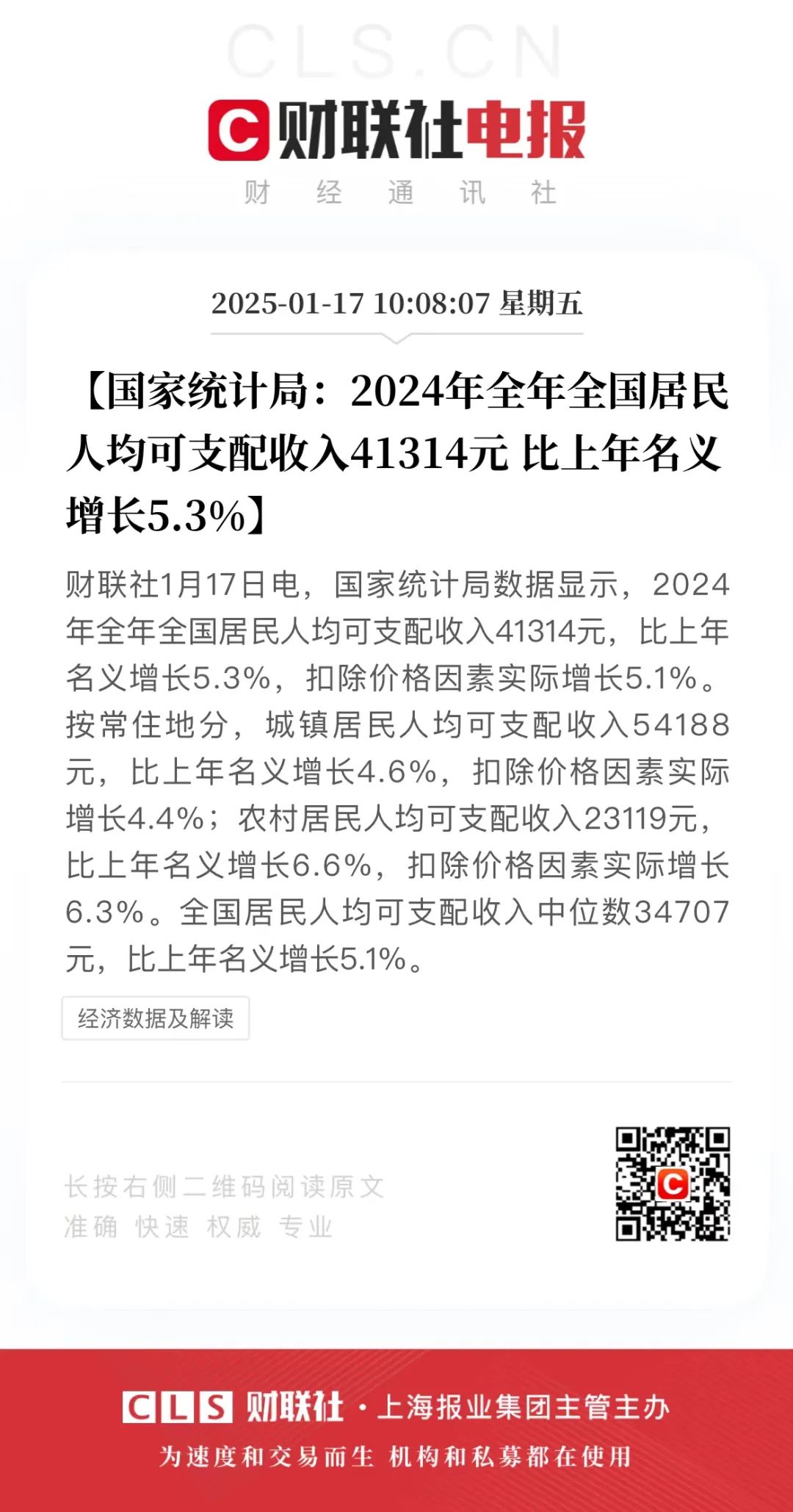 财联社向上滑动看下一个原标题:《统计局:2024年全年全国居民人均可支配收入41314元》