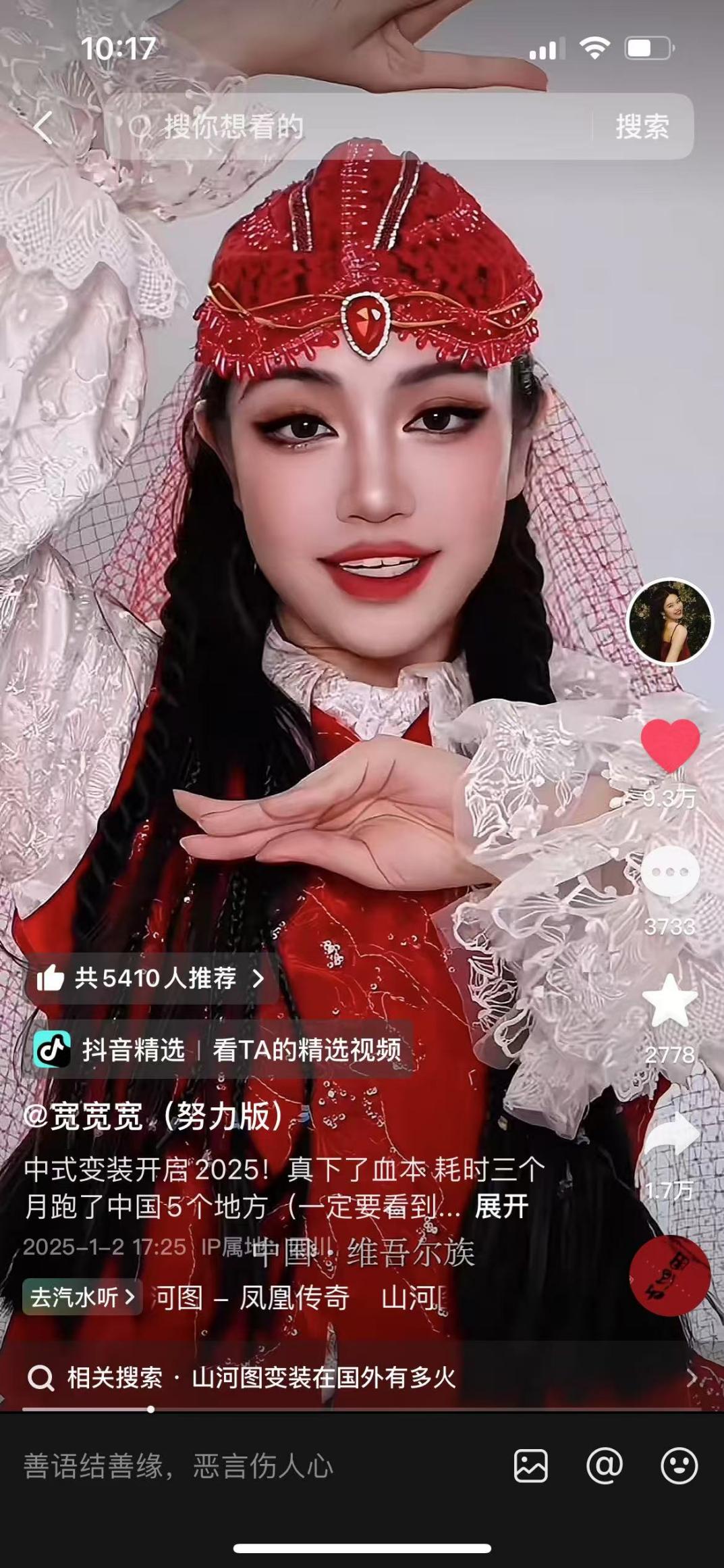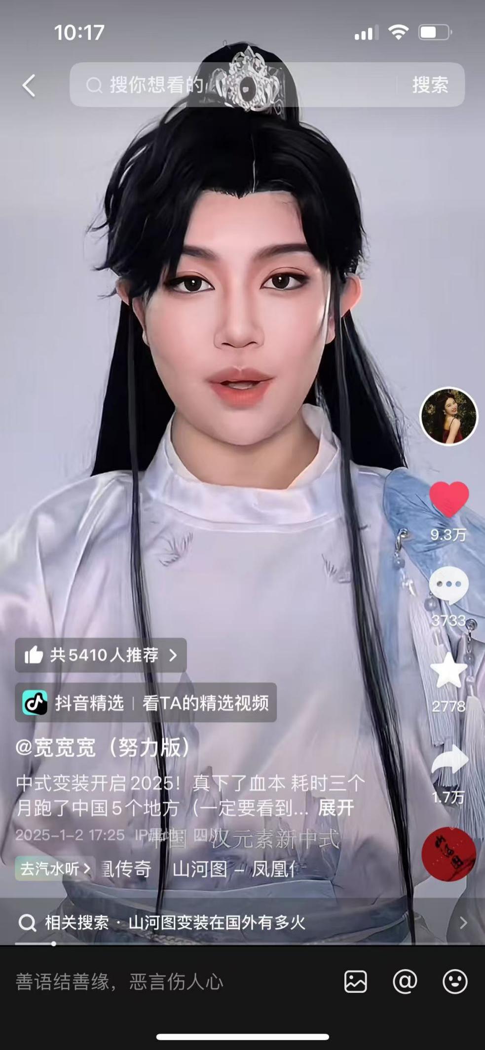 那条爆火的国风变装视频不仅在国内备受青睐,更是在海外掀起热潮。“宽宽宽(努力版)”回忆说,视频在抖音平台上发布后热度飙升,从当天晚上10时30分到晚上12时,点赞量就迅速达到20万左右,随后更是突破千万大关。众多粉丝在评论区留言,呼吁将视频分享到外网,让外国朋友看看什么是“中式高端局”。