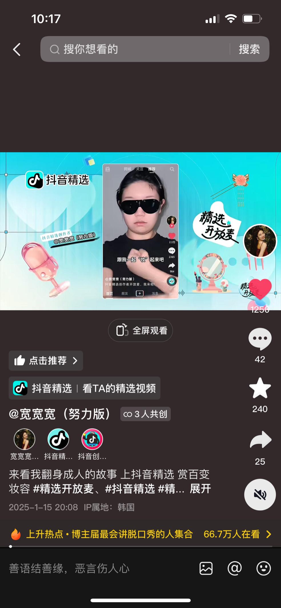凭借一系列优质美妆视频,“宽宽宽(努力版)”在2024年成功入选抖音精选作者,她深感幸运。抖音精选聚合了像她这样的优质创作者,无论是在美妆、知识科普还是文化解读领域,都为用户筛选出有收获感、共鸣感与惊喜感的内容,让人们在信息洪流中迅速找到价值所在。