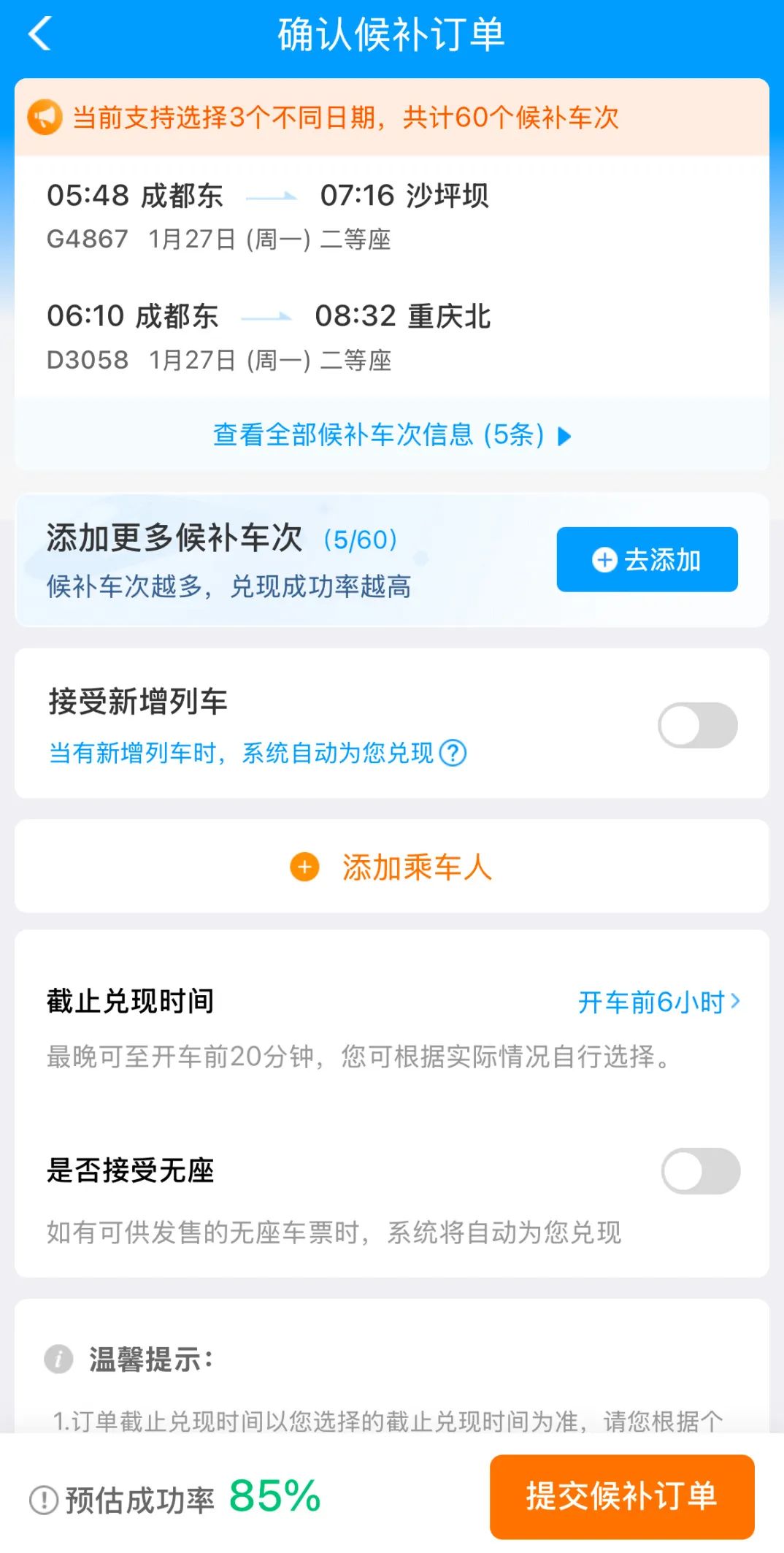 候补购票功能怎么用?如遇所需车次、席别无票时