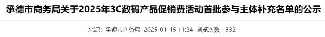 按照国家发展改革委、财政部《关于加力支持大规模设备更新和消费品以旧换新的若干措施》及省商务厅部署,根据《关于补充征集2025年全市3C数码产品促消费活动首批参与主体的通知》要求,经企业自愿申报、各县(市、区)商务主管部门初审推荐、市商务局复审,拟确定河北省(承德市)3C数码产品促消费活动首批参与主体补充名单,共计50家,现予以公示(名单见附件)。2025年承德市3C数码产品促消费活动参与主体补充名单序号区县企业名称门店名称1双桥区承德市昊新电脑商贸有限公司昊新联想专卖店2承德市华雯电子商贸有限公司华文电子世纪城店3承德冀蓝机器人有限公司冀蓝机器人天山店4承德市万佳华录商贸有限公司华录通讯连锁文化大厦店华录通讯连锁邮政店5双桥区亿达通讯器材商店亿达通讯器材商店6双滦区承德市致尚商贸有限公司小米之家河北承德宜佳旺专卖店7承德市双滦区精诚手机维修部承德市双滦区精诚手机维修部8承德市百盛通讯器材有限公司双滦分公司百盛双滦小米店9承德市百盛通讯器材有限公司滦河分公司百盛滦河店10双滦区闫石手机销售部双滦区闫石手机销售部11双滦区耀辉手机店双滦区耀辉手机店12营子鹰手营子矿区军辉手机店鹰手营子矿区军辉手机店13营子飞跃通讯营子飞跃通讯14高新区热河百盛(承德)通讯科技有限公司高新 百盛时代广场小米店 15平泉市平泉市平泉镇盛燕手机店海燕手机城16平泉市平泉镇宾燕手机店中国移动厅 移动优选17平泉市平泉镇天恒手机店VIVO官方授权体验店18宽城县宽城满族自治县天言商贸有限公司华为手机宽城民族街店19承德县承德县锋行电子产品店(个人独资)承德县锋行电子产品店(个人独资)承德县Oppp官方授权体验店(承德县板城大街店)20承德卓辰汽车租赁有限公司承德县佳音手机经销店21滦平县滦平航俊商贸有限公司华为授权体验店22承德市百盛通讯器材有限公司滦平分公司百盛滦平店23承德信捷通讯设备销售有限公司小米体验店24滦平迪讯通讯设备销售有限公司华为授权体验店25隆化县承德圣创商贸有限公司荣耀授权体验店恒达手机数码店华为掌讯店OPPO专卖店26兴隆县兴隆县蓝旗营蓝博通讯部蓝旗营蓝博通讯27兴隆县三道河纪东通讯器材商店三道河纪东通讯28兴隆县晓飞电脑通讯行晓飞电脑通讯行29兴隆县迅达通讯部迅达通讯部30兴隆县半壁山新伟达通讯器材超市半壁山新伟达通讯器材超市31兴隆县半壁山通坤手机超市半壁山通坤手机超市32兴隆县挂兰峪杰达通讯杰达通讯33兴隆县聚宁商贸店聚宁商贸34兴隆县新前沿通讯店新前沿通讯店润科通讯店前沿通讯店35兴隆县正达通讯部正达通讯部36兴隆县鼎信电子通讯行鼎信电子通讯行37兴隆县荣讯手机行荣讯手机行38丰宁县丰宁满族自治县东旺商贸有限公司华联手机超市华为专卖店移动营业厅39围场县围场县围场镇鹏大电脑数码电子城围场县围场镇鹏大电脑数码电子城40围场县围场镇和创手机店围场县围场镇和创手机店41围场县围场镇佳亿通讯手机店围场县围场镇佳亿通讯手机店42围场县围场镇宇通科技手机数码专营店宇通科技手机数码专营店43围场县世通通讯门市世通通讯门市44围场县王子国手机超市王子国手机超市45围场县围场镇数码通讯指定专营店围场县围场镇数码通讯指定专营店46围场县围场镇海网通讯门市大诚手机超市47双桥区河北广电网络集团承德有限公司河北广电网络集团承德有限公司商城营业厅48承德县中国移动通信集团河北有限公司承德分公司承德县下板城珠源路直营店丰宁县丰宁县大阁镇宁丰路直营店宽城县宽城县民族街直营店隆化县隆化县兴洲路直营店滦平县滦平县中兴路直营店平泉县平泉市平泉镇榆洲中路直营店双滦区双滦区双塔山中心大街直营店双桥区双桥区热河大厦直营店双桥区双桥区武烈路直营店双桥区双桥区西大街直营店双桥区双桥区新华园直营店双桥区双桥区学院路直营店围场县围场县木兰中路直营店兴隆县兴隆县兴隆镇东大街直营店营子区营子区桥南路直营店49宽城县中国联合网络通信有限公司承德市分公司民族街营业厅隆化县兴洲路营业厅丰宁县庆丰街营业厅围场县木兰中路营业厅滦平县北大街营业厅兴隆县东大街营业厅承德县板城大街营业厅平泉市喧哗街营业厅营子区营子区营业厅双滦区双塔山营业厅高新区大石庙营业厅双桥区南营子营业厅双桥区火神庙营业厅50承德县承德腾创通讯有限公司 承德县板城大街分公司承德县 承德县南江汇景小区分公司承德县 承德县板城东大街分公司丰宁县 丰宁县第四分公司丰宁县 丰宁县第三分公司丰宁县 丰宁县第二分公司丰宁县 丰宁县第一分公司高新区 承德高新区凤凰御景分公司高新区 承德高新区开发东区分公司宽城县 宽城县第一分公司宽城县 宽城县第二分公司宽城县 宽城县第三分公司宽城县 宽城县第六分公司隆化县 隆化县通站路分公司隆化县 隆化县苔山路分公司隆化县 隆化县龙骧南苑分公司隆化县 隆化建设街分公司滦平县 滦平县中兴路分公司滦平县 滦平县新建路分公司滦平县 滦平县鑫港分公司平泉市 平泉市水岸华庭分公司平泉市 平泉市琚源公馆分公司平泉市 平泉市榆州中路分公司平泉市 平泉市市场北路分公司双滦区 双滦区中心大街分公司双滦区 双滦区滦河大街分公司双滦区 双滦区宜佳