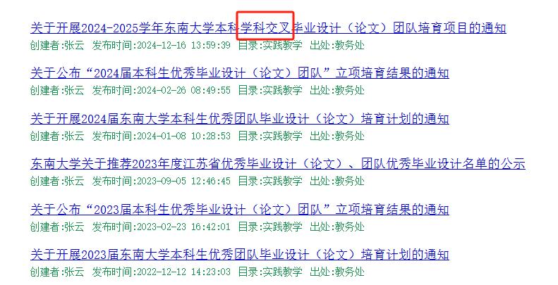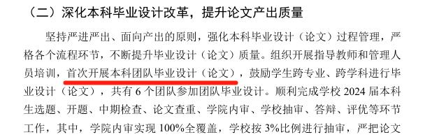 不过,在交叉学科越来越受到重视的今天,团队毕设更具有了跨学科交叉融合的意味,越来越多的高校在近几年首次入局“团队毕业设计(论文)”,且尤其强调组建跨学科团队。比如2023年,在前两年鼓励开展“团队设计”“校企联合设计”的基础上,中国石油大学(华东)第一次将开展“跨学科专业毕业设计”加入毕业设计模式改革的要求中;去年12月,东南大学也第一次将“学科交叉”写入开展团队毕设培育项目的通知标题中。