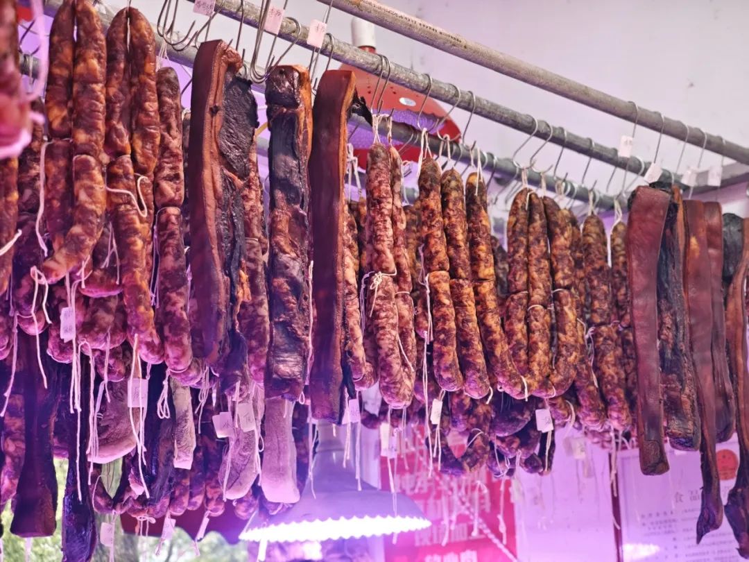 除了提供加工,家里没地方晾晒的也可“寄存”在店里。“香肠有广式、原味、五香、香辣、麻辣5种口味,还有酱油肉和咸肉。”店家介绍道。一般香肠从制作到风干需要十天半个月左右,咸肉需要一个星期,酱油肉需要腌制3天。小编打探到,制作一根香肠,大约在20元—30元之间。烹饪方法也很简单,最直接可以温水冲洗切片上锅蒸制,咸肉可以烧汤或蒸土豆,酱油肉切薄皮炒熟出锅前撒上一把大蒜叶……四方食货,人间烟火,“年味”也在煎炒烹炸焖熘熬炖间逐渐升温。