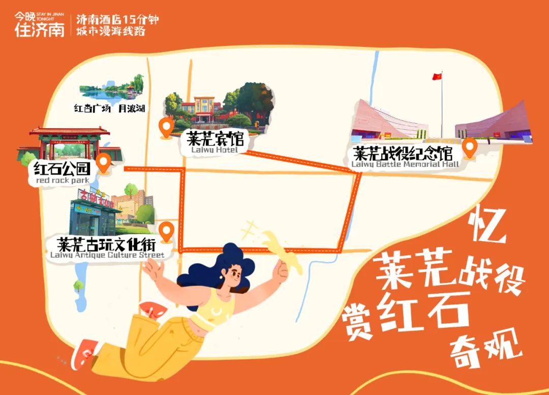 莱芜宾馆→莱芜战役纪念馆→莱芜古玩文化街→红石公园(红杏广场、月波湖)→莱芜宾馆