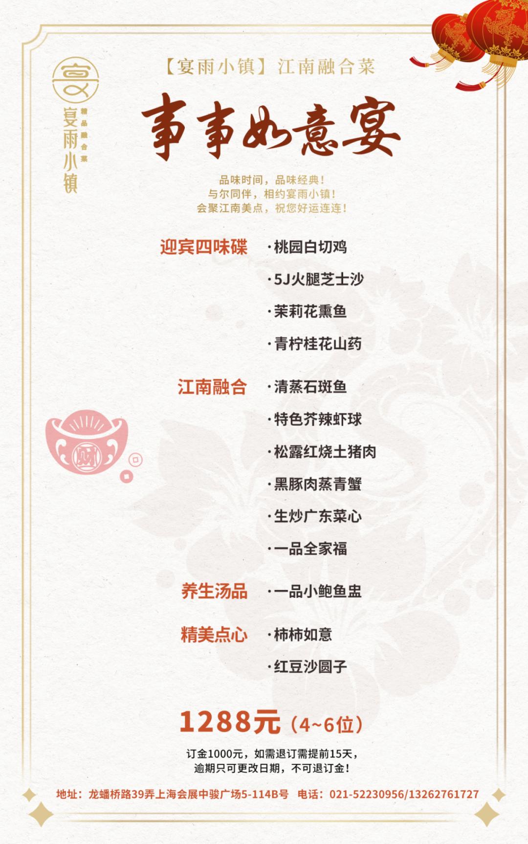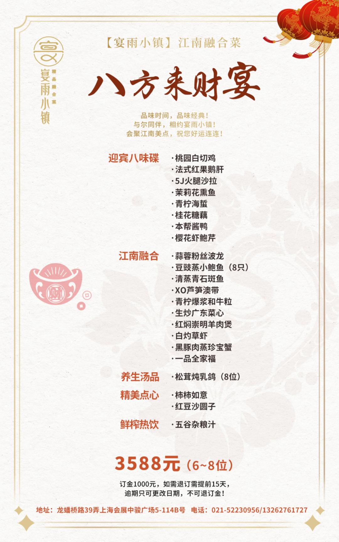 主打江南融合菜的宴雨小镇推出多款不同菜品、价位的年夜饭套餐,每一个套餐都蕴含着对传统文化的致敬与现代创新的融合,让食客们在团聚的时刻共享美味,喜迎新一年。