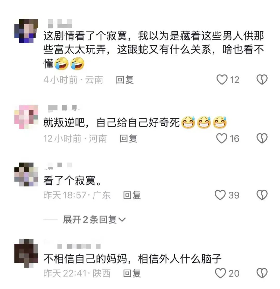 在短剧的评论区里,有不少观众对结尾表示不解。社交平台上有关此短剧的讨论大多围绕结局解读。有一份广为流传的名为《人形蛇》的小说很像是这部短剧的原著,其中就明确提出了“人彘蛇”的概念,最后母亲在女儿报警之后跳楼自杀。而《蛇园》的结尾改编则来了个大反转,志怪故事最后变成了母女和解大团圆,对于此前的诸多悬念也没有解释,草率结尾会伤害同类型题材,观众一次次“上当受骗”后,也不会再点开同类型短剧。