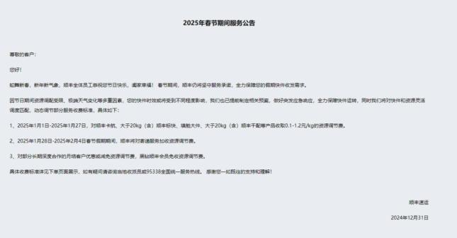 顺丰速递:今年春节期间仍将坚守服务承诺,全力保障假期快件收发需求。1月1日-1月27日,对顺丰卡航、大于20kg(含)顺丰标快、填舱大件、大于20kg(含)顺丰干配等产品收取0.1元-1.2元/kg的资源调节费。1月28日-2月4日春节假期期间,顺丰将对寄递服务加收资源调节费。