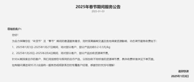 德邦快递:为全力保障消费者在“年货节”及“春节”期间的寄递服务需求,将动态调节服务收费。1月3日-1月27日期间,将对部分客户、部分产品加收0.2元-0.5元/kg,1月28日-2月4日期间,将对部分客户、部分产品加收资源调节费。