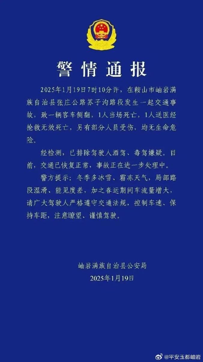 2025年1月19日7时10分许,在辽宁鞍山市岫岩满族自治县张庄公路苏子沟路段发生一起交通事故,致一辆客车侧翻,1人当场死亡,1人送医经抢救无效死亡,另有部分人员受伤,均无生命危险。