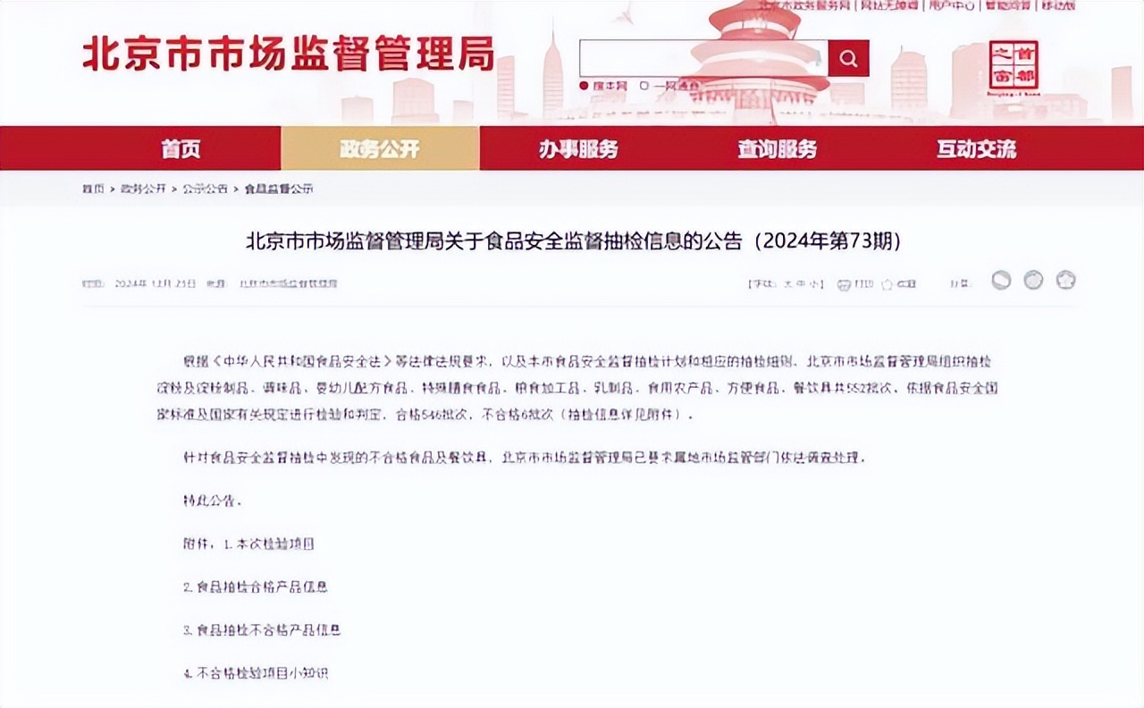 图为北京市市场监督管理局关于食品安全监督抽检信息的公告(2024年第73期)