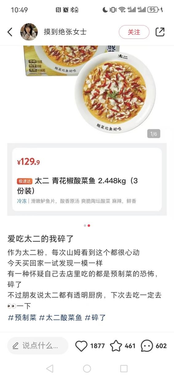 一位小红书用户指出,此前“太二酸菜鱼”不仅辣度无法调整,甚至连牛肉中的香菜也无法去除,这与预制菜的批量化生产和统一口味有很大的相似性。另有消费者提到,在用餐时发现鱼肉块紧密粘连,质地不够新鲜,怀疑鱼片是从冷库取出后直接下锅处理。该消费者还表示,盘中的鱼尾和鱼骨缺失,向店长反映后,店方解释称是“厨师未打散鱼片”,并为此免去了餐费。