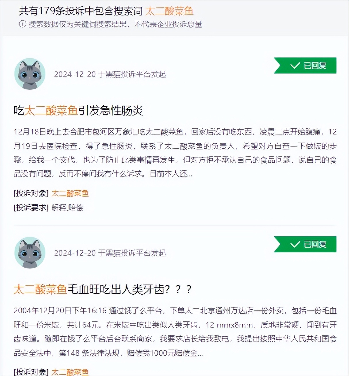 在黑猫投诉平台上,记者看到,关于“太二酸菜鱼”的投诉共计179条,主要集中在消费者反映菜品中出现异物、用餐后出现腹泻和肠胃不适等食品安全方面问题。