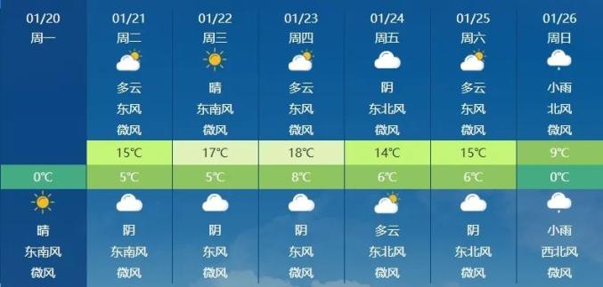全省晴到多云。最高温度:淮北北部地区12~13℃,苏南地区15~16℃,其他地区14℃左右;最低温度:淮北北部地区0~-1℃,沿江和苏南地区3~4℃,其他地区1℃左右。全省偏东风4级左右。
