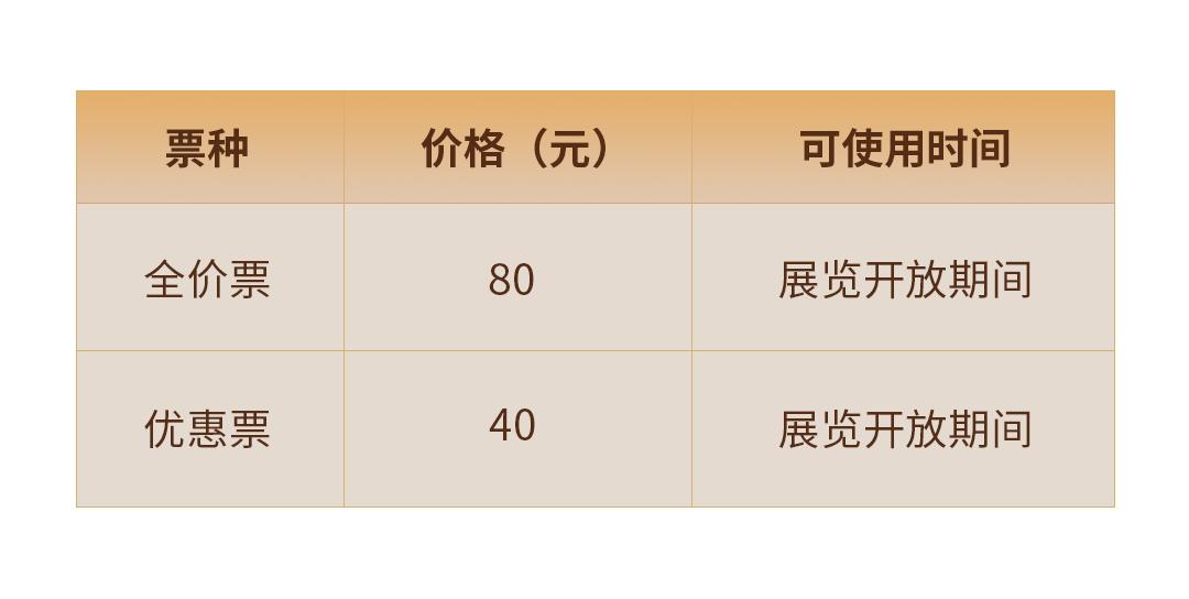 展览门票分为全价票和优惠票。全价票80元、优惠票40元。