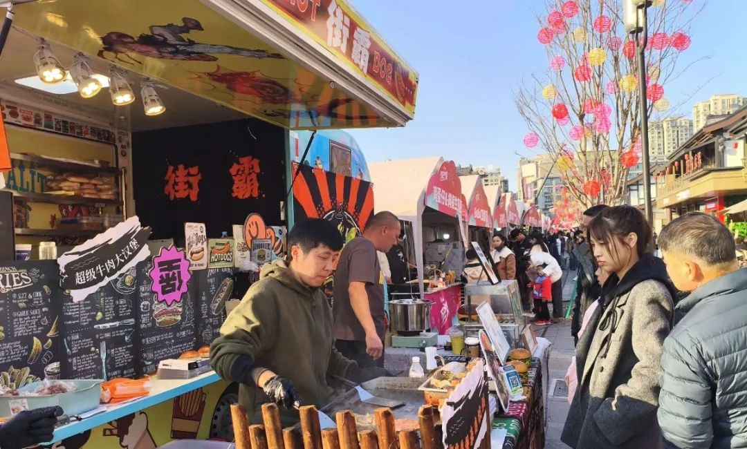 有的开着自家的房车,有的搬来了作坊里的设备,从各式小吃到手作周边一应俱全,还有不少沿街商户、返乡大学生也加入了摆摊大军,百米长的步行街布满摊位,游人如织。