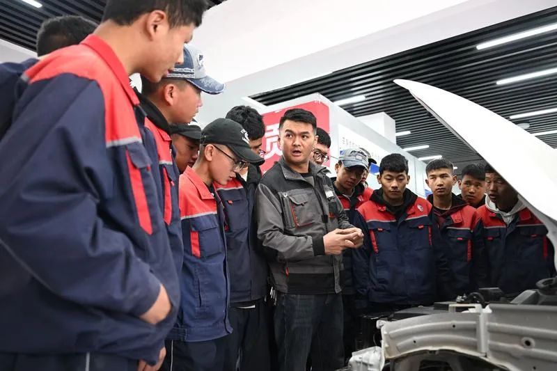 近年来,青海省海南藏族自治州加大职业技术人才培养力度,优化职业教育办学结构,以就业市场需求为导向,通过推进学校与企业联合办学,创新校企合作、定向培养等办学模式,拓宽职业教育毕业生就业渠道。图为汽车维修专业教师在指导学生进行实训。新华社记者 央秀达珍 摄