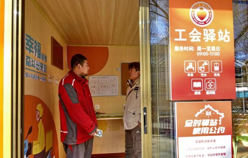 北京市朝阳区八里庄街道持续开展针对快递员、外卖员等新就业群体的友好服务行动,为他们提供吃饭喝水、充电休息等贴心服务。同时,赋予新就业群体爱心助老跑腿员、安全隐患排查员等志愿者身份,形成“双向友好”,提升城市温度。图为工会驿站工作人员为快递员提供服务。新华社记者 李欣 摄