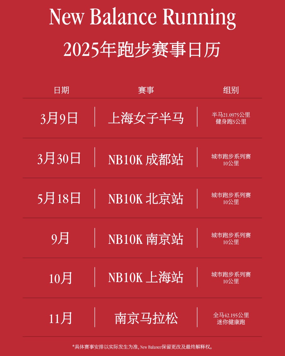 2025年,New Balance将通过三大主题赛事——“妳的主场”2025上海女子半程马拉松赛、“城市主场”NB10K城市跑步系列赛,以及“你的主场”南京马拉松,为跑者打造值得铭记的主场时刻。“你的主场”不仅是一场比赛,更是一份对跑步的热爱宣言。