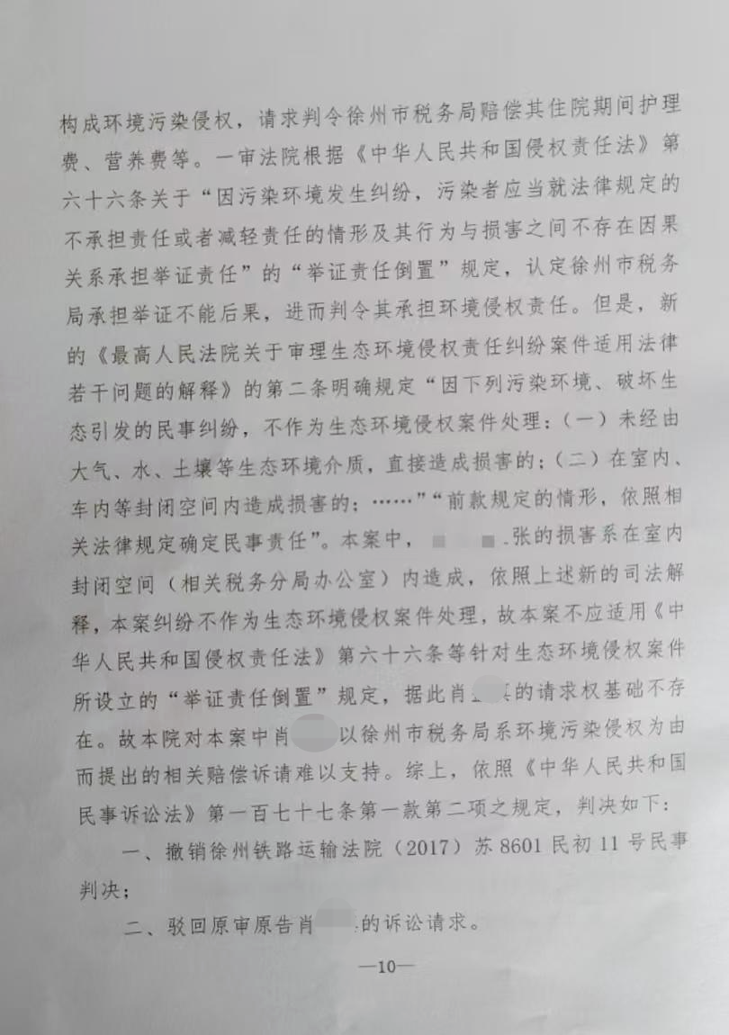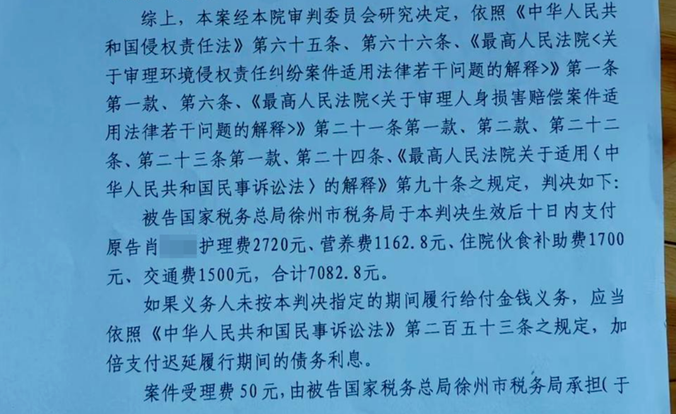2017年,肖先生起诉徐州市税务局,要求其支付护理费、营养费、伙食补助费、交通费等合计约7000元。徐州铁路运输法院作出一审判决,认为徐州市税务局依法应当承担环境侵权民事责任,并判决税务局支付相关费用。