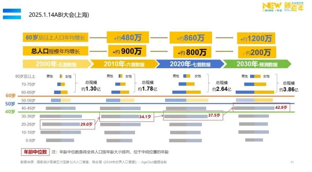 这是中国的整个的年龄中位数,通常情况下一个国家、一个地区年龄中位数达到30岁以上,国家和地区就进入老龄化了,这是一个新视角;之前一般是60岁以上人口或者65岁以上能够达到一定比例就是老龄化。我们会发现40-50岁年龄段的人最多,他们年龄不断增长的过程,也是市场增长的过程。