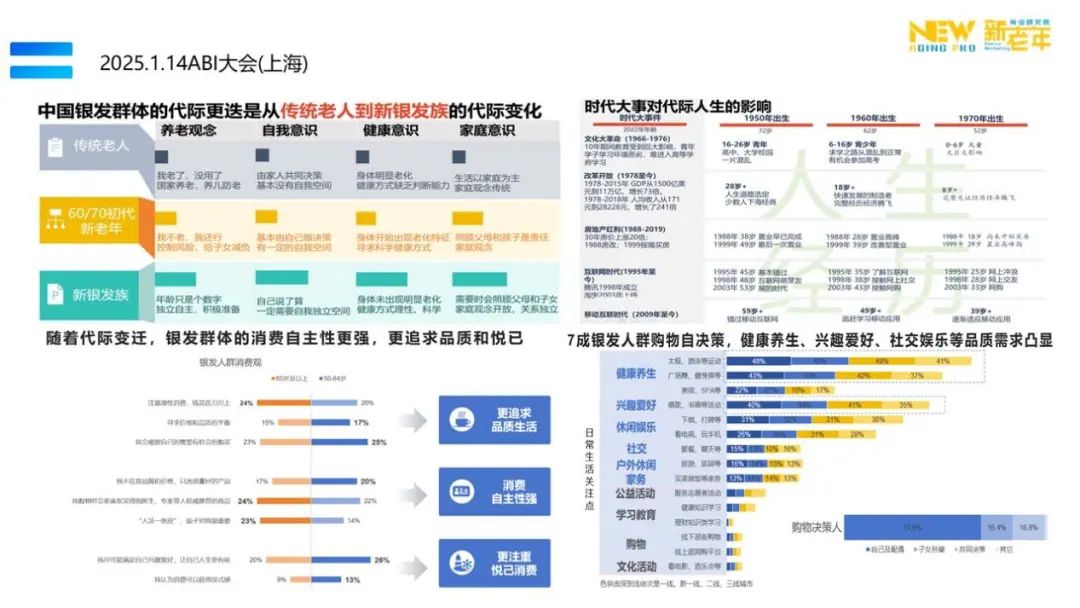 如果我们真的要去研究银发市场,第一件事情就是给老年人撕标签,不要把老年人定义为老年人、没有个性化的老年人;第二,银发老人之前的人生角色可能是一个公司的员工、是一个家庭主妇、是一个母亲、是一个女儿,是很多外部身份的结合,到现在她们想要做自己,变得越来越自我了,要为自己而活,这是今天消费者非常典型的特征。