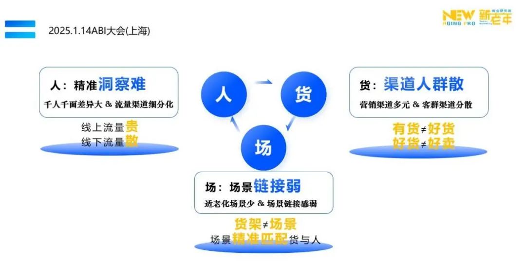 当前,各个行业都在为老年群体细分,渠道也正在为老年人群细分。同时,银发产业发展面临着人、货、场难以精准匹配的痛点。