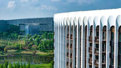 好比是成都的一个世外桃源,以纯白色线条为主的曲面建筑,和周围的湖景、公园,自然而然地融为一体