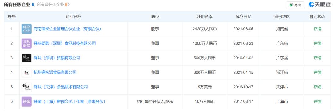 据天眼查,2016年-2021年,谢霆锋在内地所有任职公司一共有6家:锋味船歌(深圳)食品科技有限公司、锋味(深圳)贸易有限公司、锋味(天津)食品技术有限公司、锋蜜(上海)影视文化工作室、海南锋投企业管理合伙企业、杭州锋味派食品有限公司,业务涉及食品、贸易、影视、企管等多个领域。
