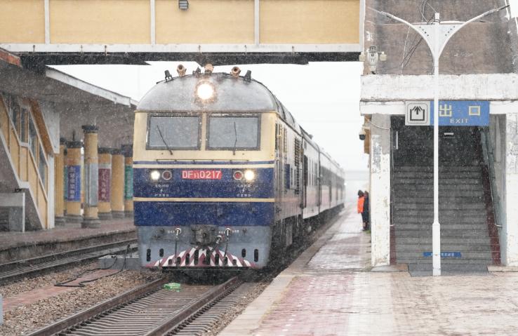 1月13日17时55分,6245次列车运行10小时45分后抵达我国铁路网络最北端的古莲站 。摄影/上游新闻记者 张莹