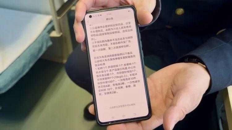 列车长王洪刚打开手机,在名为“兴安北极亲人公益慢火车服务微信群”中,记录着沿线旅客的捎带需求。“这趟车途经的大多是乘降所,很多站没有公路相通,尤其是在冬季,这趟车就成了沿线居民外出唯一的交通工具。为了方便旅客,列车上开展了捎带服务,帮旅客捎带生活用品、农副产品等。”王洪刚介绍,“有的旅客需要捎带米面粮油,有的需要捎带药品,我都会一一记录下来,到站后及时交给指定的收货人或者站所的值班员。”