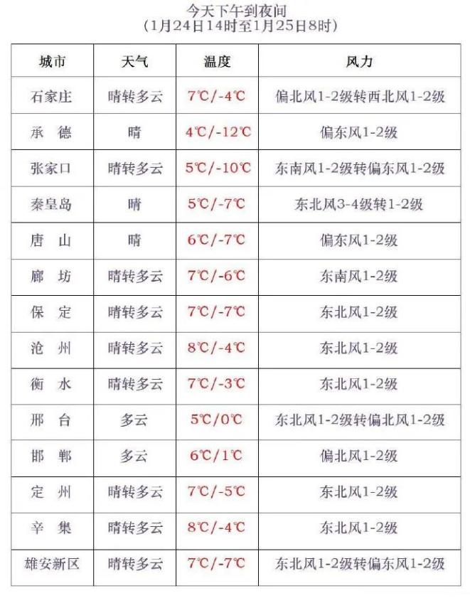 今天下午到夜间,邯郸西南部多云转阴,承德、唐山、秦皇岛晴间多云,其他地区多云间晴。最高气温,张家口北部、承德北部-5~2℃,其他地区3~8℃。最低气温,张家口北部和西部、承德、秦皇岛北部-19~-10℃,其他地区-9~2℃。