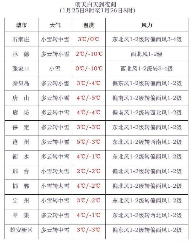 明天夜间到26日,全省多云转阴,张家口南部和保定、廊坊及以南地区有中雪,部分地区有大雪,其他地区有小雪。