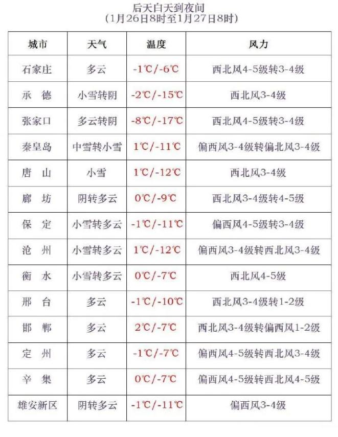 26日夜间到27日,唐山、秦皇岛阴有小雪到中雪,张家口北部、承德多云间阴有小雪或零星小雪,其他地区多云转晴。