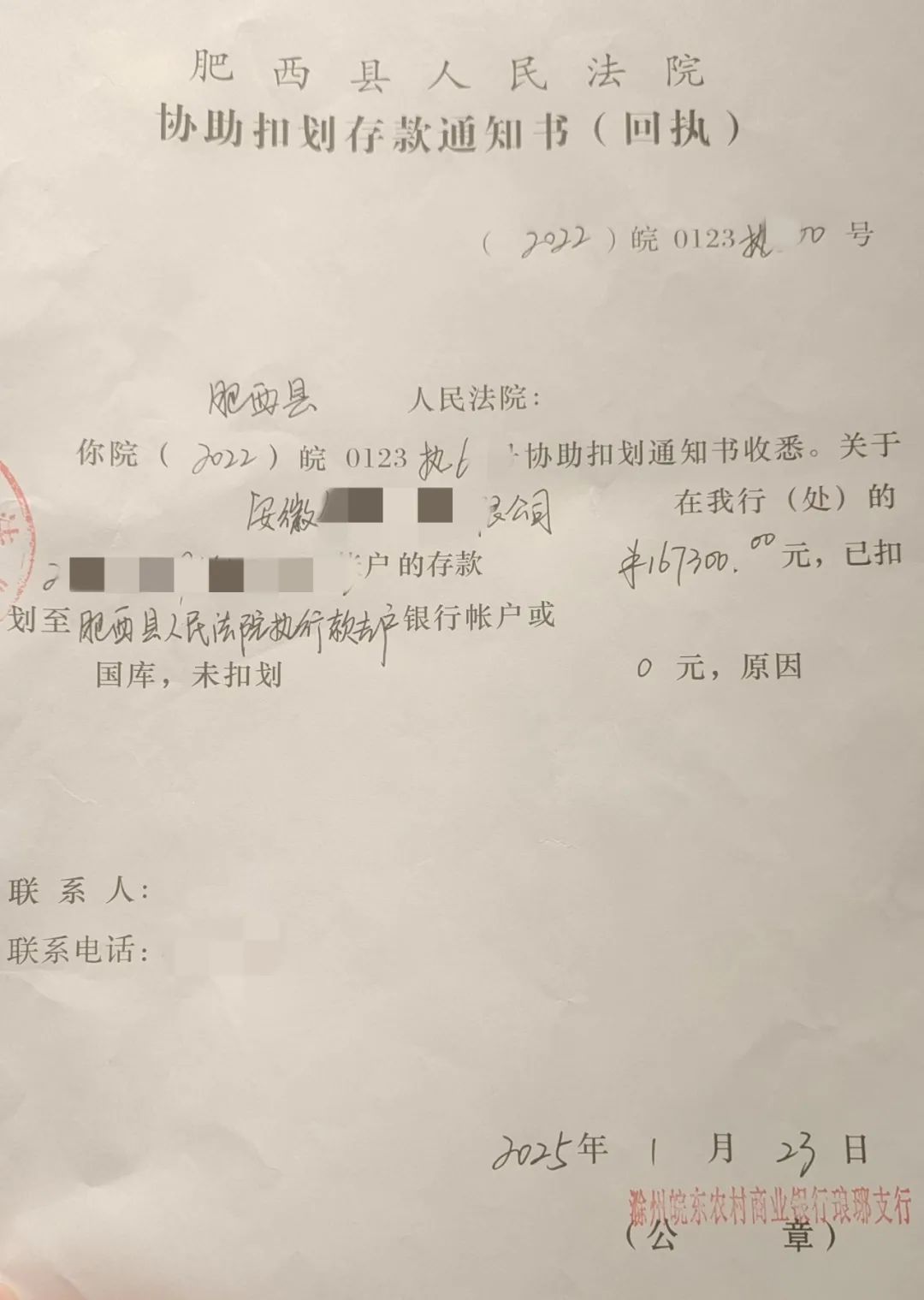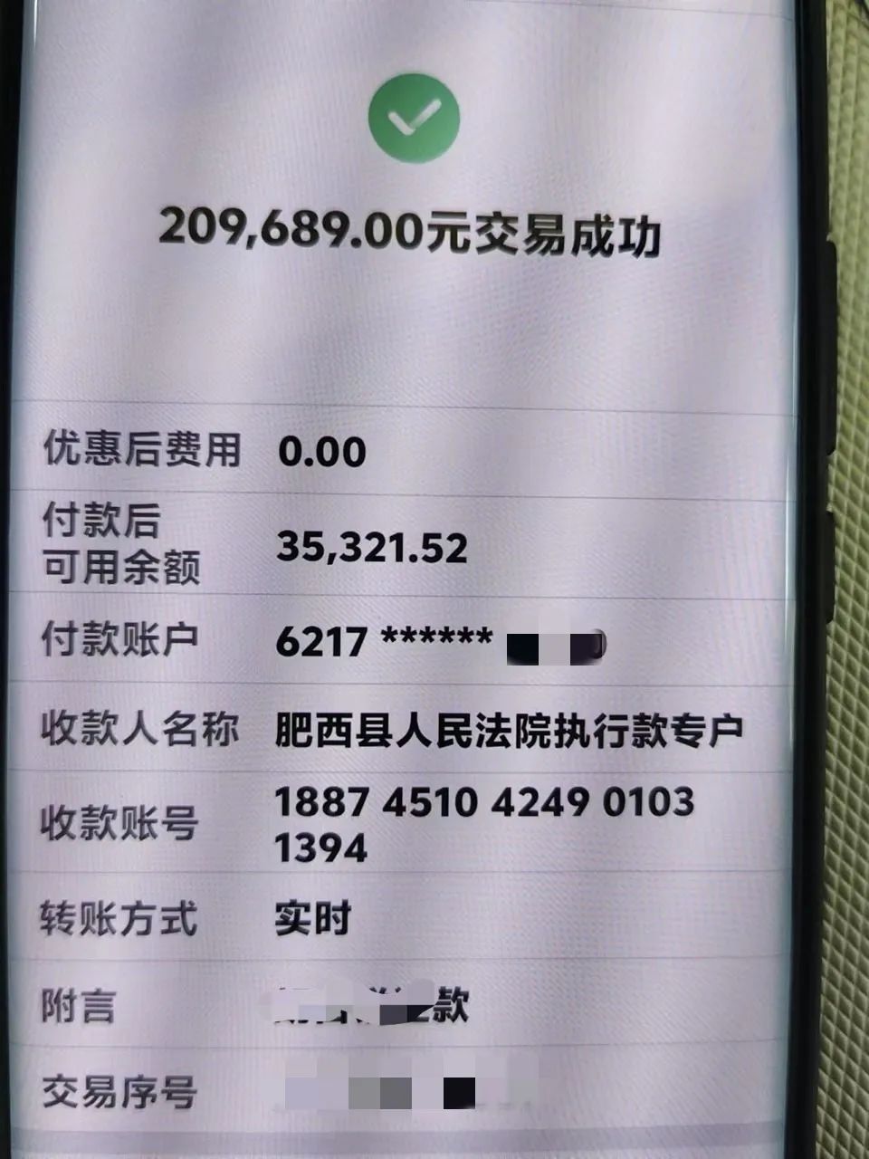 “全部标的款222764.27元扣划至肥西法院执行款专户,成功执结三个案件。”