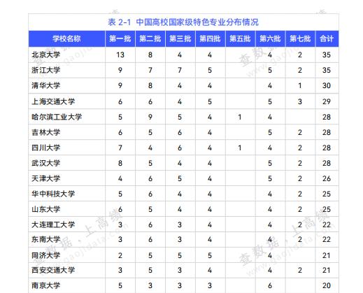 此外,入选国家级特色专业数量超20个的学校还有天津大学、华中科技大学、山东大学、大连理工大学、东南大学、同济大学、西安交通大学和南京大学。