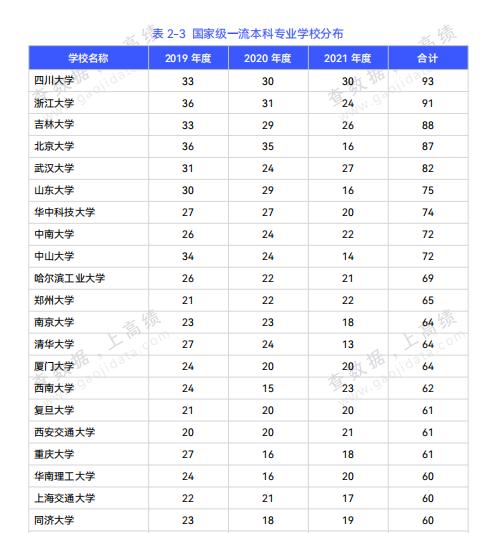 在“双万计划”的选拔中,四川大学领先全国高校,共有93个专业点入选国家级一流本科专业建设点名单。其次是浙江大学,共有91个专业点入选。除此之外,吉林大学(88个)北京大学(87个)和武汉大学(82个)的国家级一流本专业建设点均超过80个;山东大学(75个)、华中科技大学(74个)、中南大学(72个)、中山大学(72个)的国家级一流本专业建设点均超过70个。